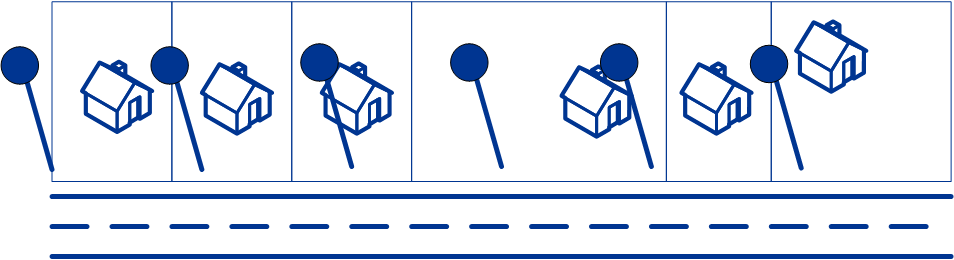 Beispielsweise zeigt das folgende Diagramm die Ergebnisse eines Vergleichs auf Straßenebene mit einem Segment mit ungleichmäßig verteilten Gebäuden. Die ersten drei Gebäude wurden einigermaßen genau geocodiert, da sie gleichmäßig verteilt liegen. Das vierte Gebäude liegt jedoch auf einer etwas größeren Parzelle als die anderen Gebäude entlang der Straße. Da bei dem Straßenebenenvergleich angenommen wird, dass die Gebäude gleichmäßig verteilt liegen, sind die Ergebnisse für das vierte, fünfte und sechste Haus nicht so präzise wie die für die ersten drei Häuser. Bei der Verwendung von Geocoding auf Punktebene wären die Ergebnisse genauer.