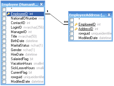 To join two objects manually, select the field by which you want to link the object with another and drag it to the corresponding field of the other object. After you finish dragging, a line connecting the linked fields will appear. Key cardinality symbols are placed at the ends of link when a corresponding relationship exists in the database.