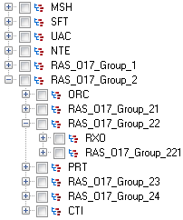 Segment groups that are nested under a segment group have an additional number appended to their group number. For example, Group_21 represents the first group nested under the second group. Further subgroups have additional numbers appended to them, such as Group_221, which for message RAS^017 represents the segment group ORDER_DETAIL_SUPPLEMENT. An example of nested groups is shown here: