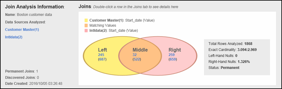 The following shows an example of a join discovered between the attribute Start_date in the left-hand side data source Customer Master and the attribute Start_date in the right-hand side data source Intldata. In the middle segment, there are 32 matching values found between the data sources in 522 data rows. In the left segment, there are 245 non-matching values and 687 non-matching rows. In the right segment, there are 259 non-matching values in 659 non-matching rows.