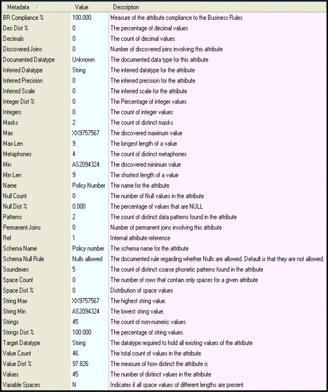 ■ Distribution of distinct values, patterns, masks, soundexes, and metaphones. ■ Completeness—schema null rule, null count, null dist%, space count, space dist%, variable spaces ■ Validity—min/max, value dist%, metaphones, soundexes ■ Consistency—masks, patterns, phrases |