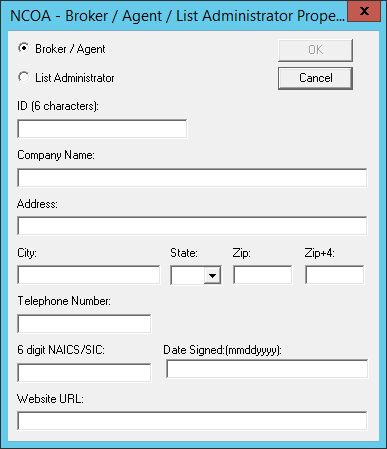 A broker or agent is a third party who submits a Move Update service request to an NCOALink licensee for a client. The broker/agent receives the updated address files from the NCOALink licensee and returns the address files to the client. A list administrator performs all address list management functions for a client. The list administrator differs from a broker/agent because, unlike a broker/agent, the list administrator does not return updated address files to the client. Use the following procedure to add a broker/agent or list administrator.