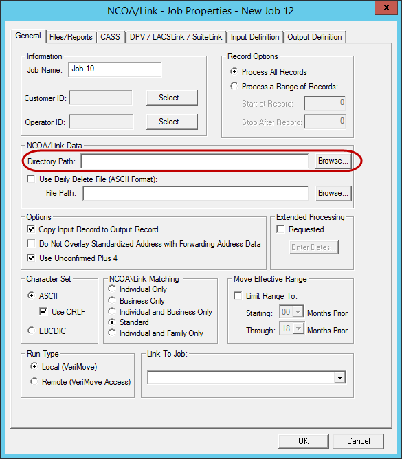 - On the General tab, enter the path to the NCOALink data files in the Directory Path field or Click Browse to open a dialog box and navigate to the location of the NCOALink data files.