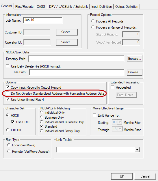 In this example, Do Not Overlay Standardized Address with Forwarding Address Data processing has not been set using the Job Properties General tab.