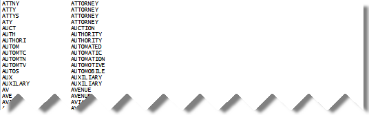 For example, a small portion of the REDEFINES-WORD-LIST table is shown below. In this example, if the input file contains “ATTNY”, the Business Name Matching process internally converts “ATTNY” to “ATTORNEY” to determine a Business Name Match against the NCOALink database.