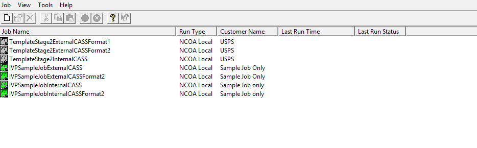 The VeriMove main window lists the jobs that have been defined for the system. The first time you open VeriMove, you will see certification templates. VeriMove includes these certification templates to simplify the USPS certification process. For information on using these certification templates, see Step 4: Create and Run Certification Jobs. After you create your own jobs, you will see those jobs listed in the main window.